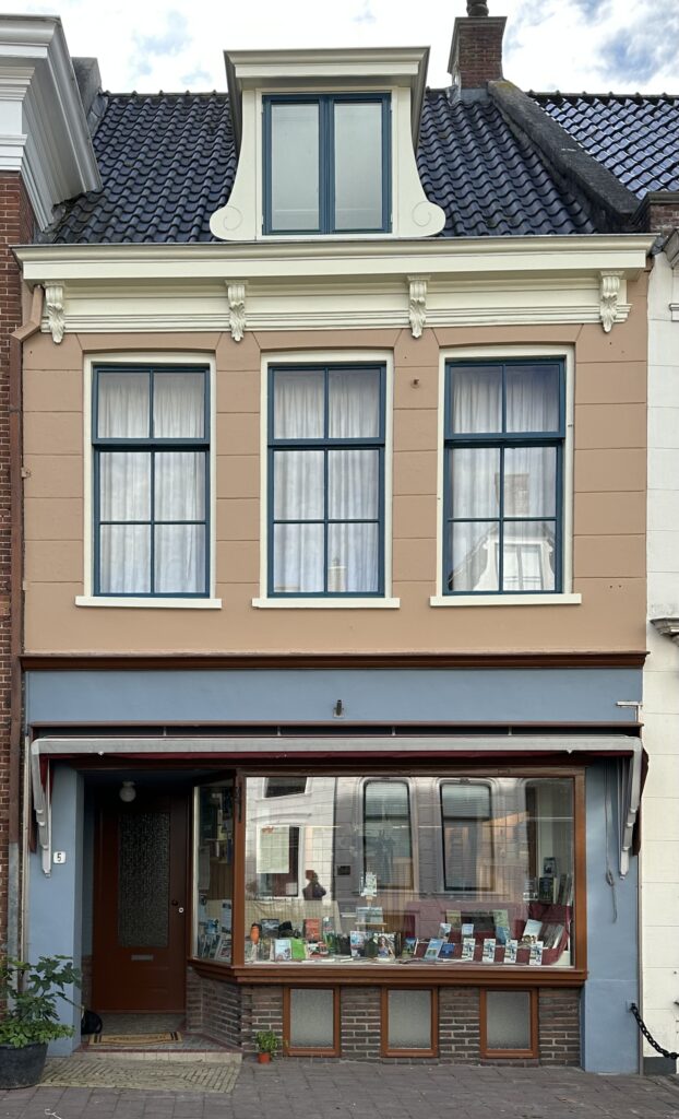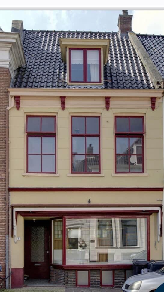 Toen we het pand kochten, waren de kleuren aan de buitenland donkerrood/wit. Door een kleurhistorisch onderzoek kwamen we erachter, dat de kleuren oorspronkelijk heel anders waren, blauwgrijs/beige. Het pand heeft nu weer die oorspronkelijke kleuren. Onze website is ook in die kleuren aangepast.